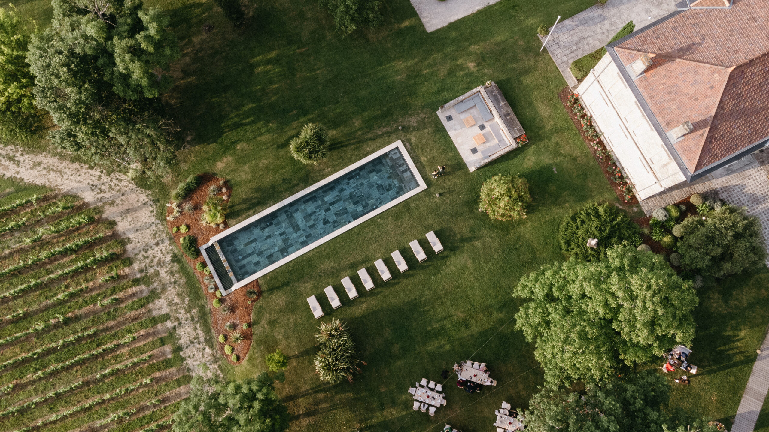 Depuis 2024, le Château abrite une nouvelle piscine de 18m de long par 4m de large, chauffée, à débordement côté vignes.