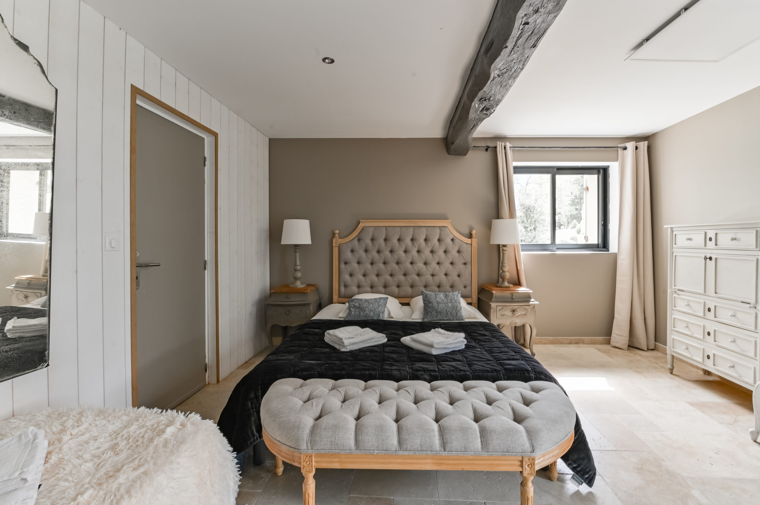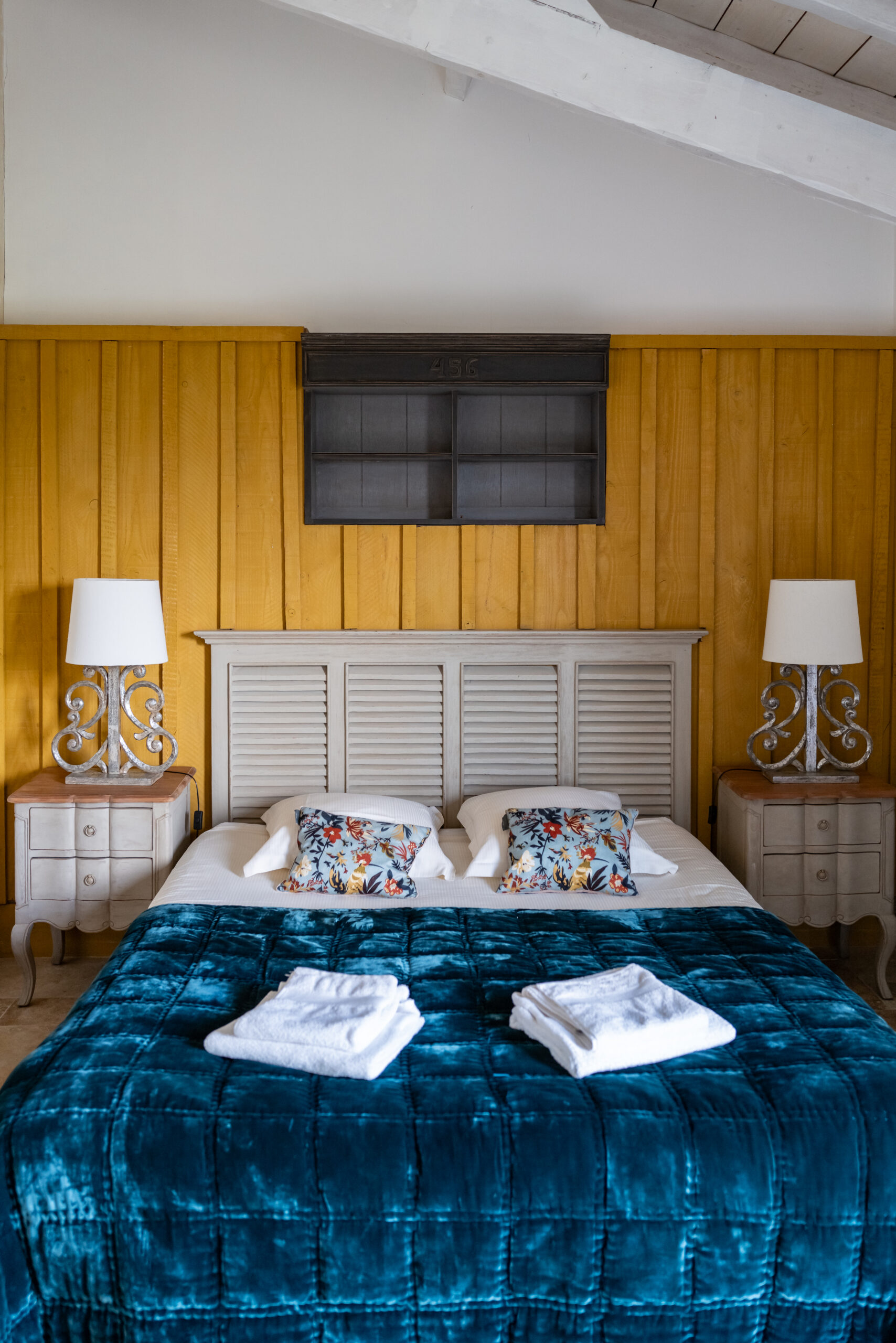 Elle est la chambre la plus spacieuse de la maison, propose un lit double (160×200), un canapé gigogne offrant deux couchages supplémentaires, ainsi qu’une salle d’eau avec douche, double vasque et WC. Sa porte-fenêtre s’ouvre directement sur les vignes du domaine.