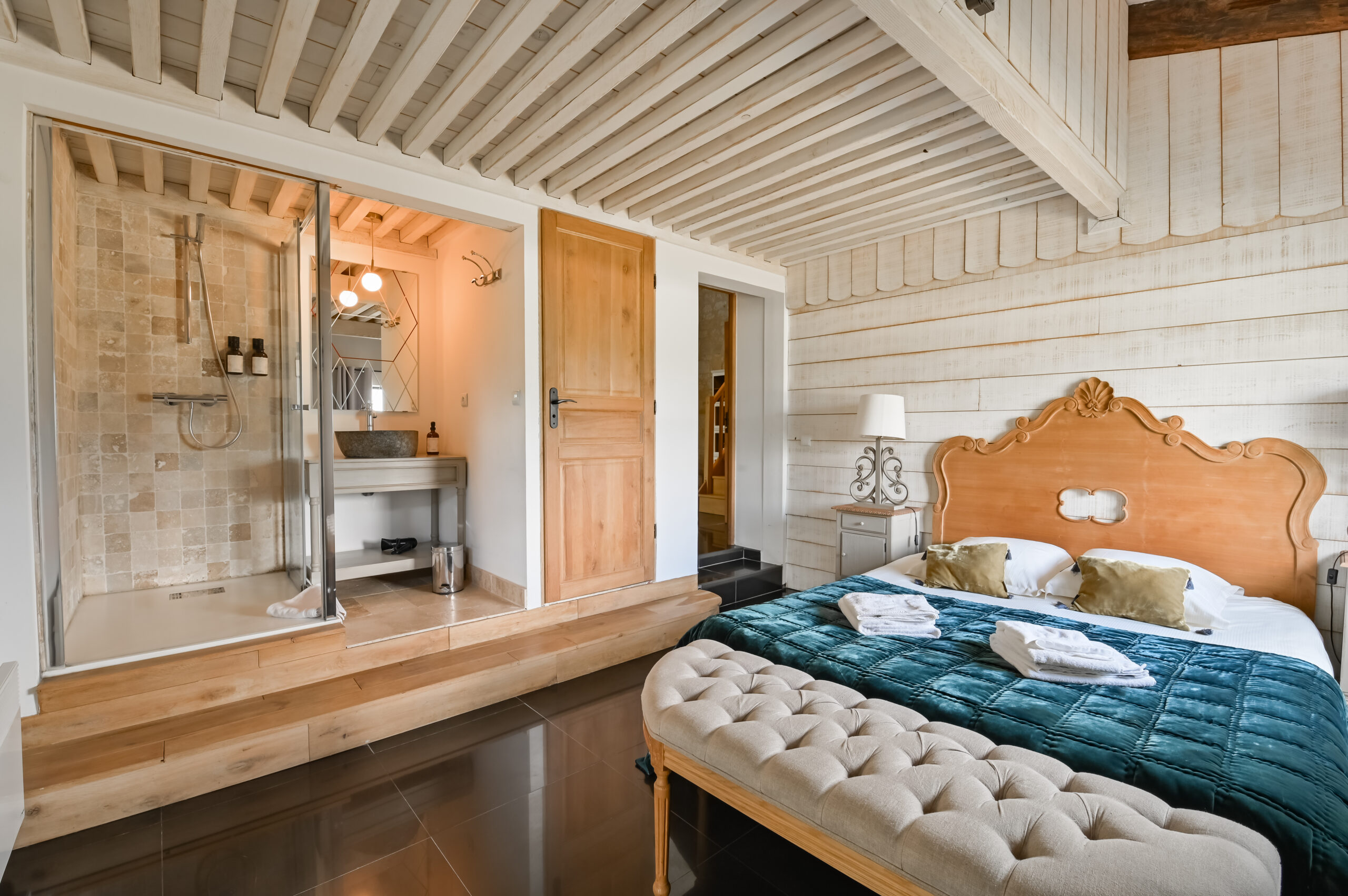Cette chambre offre une vue sur le château et les jardins à la française. Elle dispose d’un lit double (160×200), d’un canapé gigogne avec deux couchages supplémentaires et d’une salle de bain indépendante avec douche, double vasque et WC, permettant d’accueillir jusqu’à quatre personnes.